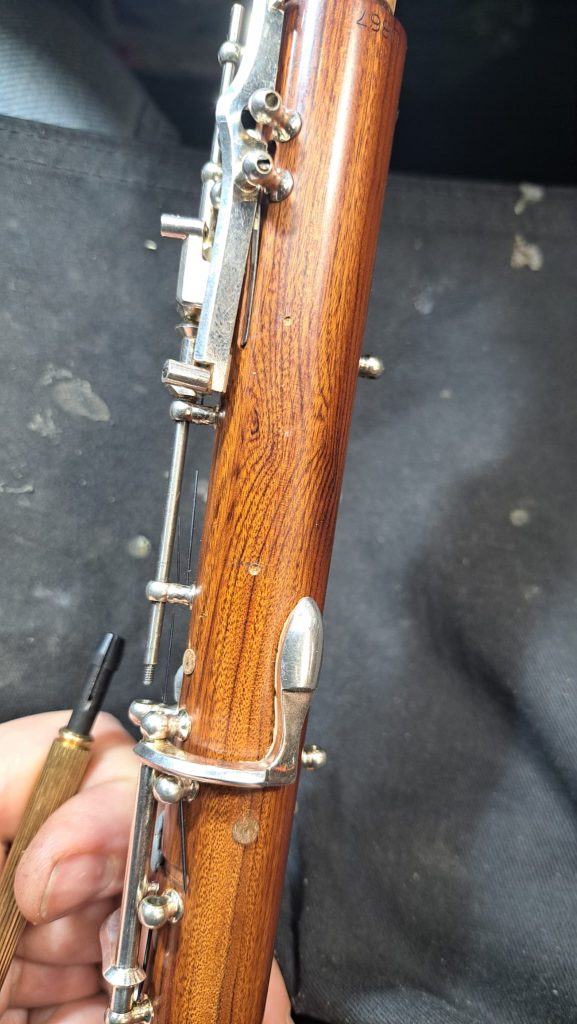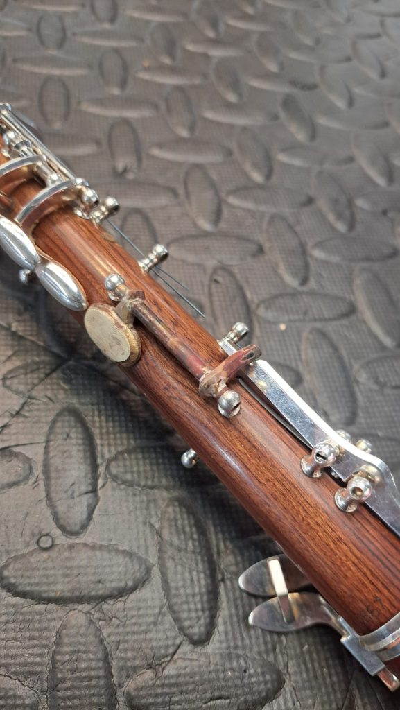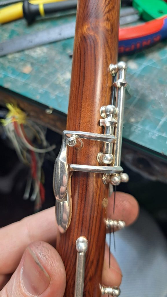 There is yet another element to consider in the conservatoire system: the index finger in the right hand interacts with the top joint keywork, activating the Bb and C keys. This ‘con-bar’ bridging across the top and bottom joints must be slightly adapted to interact with the new thumbplate, creating what is known as a ‘dual system’. This retains the conservatoire bar system, while incorporating the thumbplate.