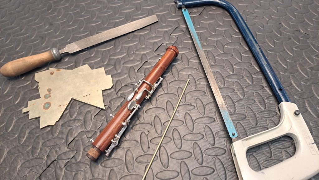 Cutting away the 3rd octave touchpiece is necessary to install a new piece. By following the same process of planning, filing, shaping and soldering, the new key takes shape. Soldering a rough piece of nickel silver into the now exposed main octave key will fill in the existing cut-out, allowing us to reduce the newly oversized surface back into a neat shape. The 3rd octave key typically has a small screw dictating the travel of the key, it only needs a very small movement, and this screw means it can be adjusted quickly and easily. Another small solder joint, tapping a thread and supplying a screw creates this neat feature.