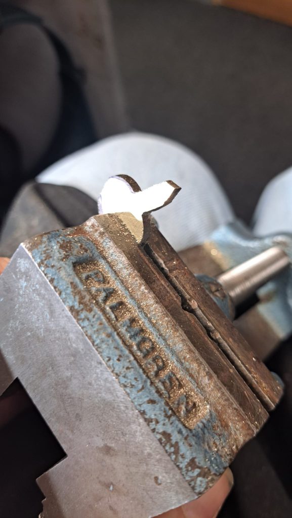 The ‘arm’ of the key is created as part of the touchpiece itself, making it super strong. It connects the touchpiece to the ‘hinge tubing’ via a neatly drilled hole, which the hinge tube threads through and connects seamlessly. Once roughly shaped, these parts are bonded using high temperature silver-solder. Lots of time is spent securing the parts in a jig; generally when making keys you’ll spend twice as long aligning and stabilising the parts prior to soldering than the soldering itself. Time invested at this stage is so important for efficient key making, so you’re not going back and correcting minor angles down the line.